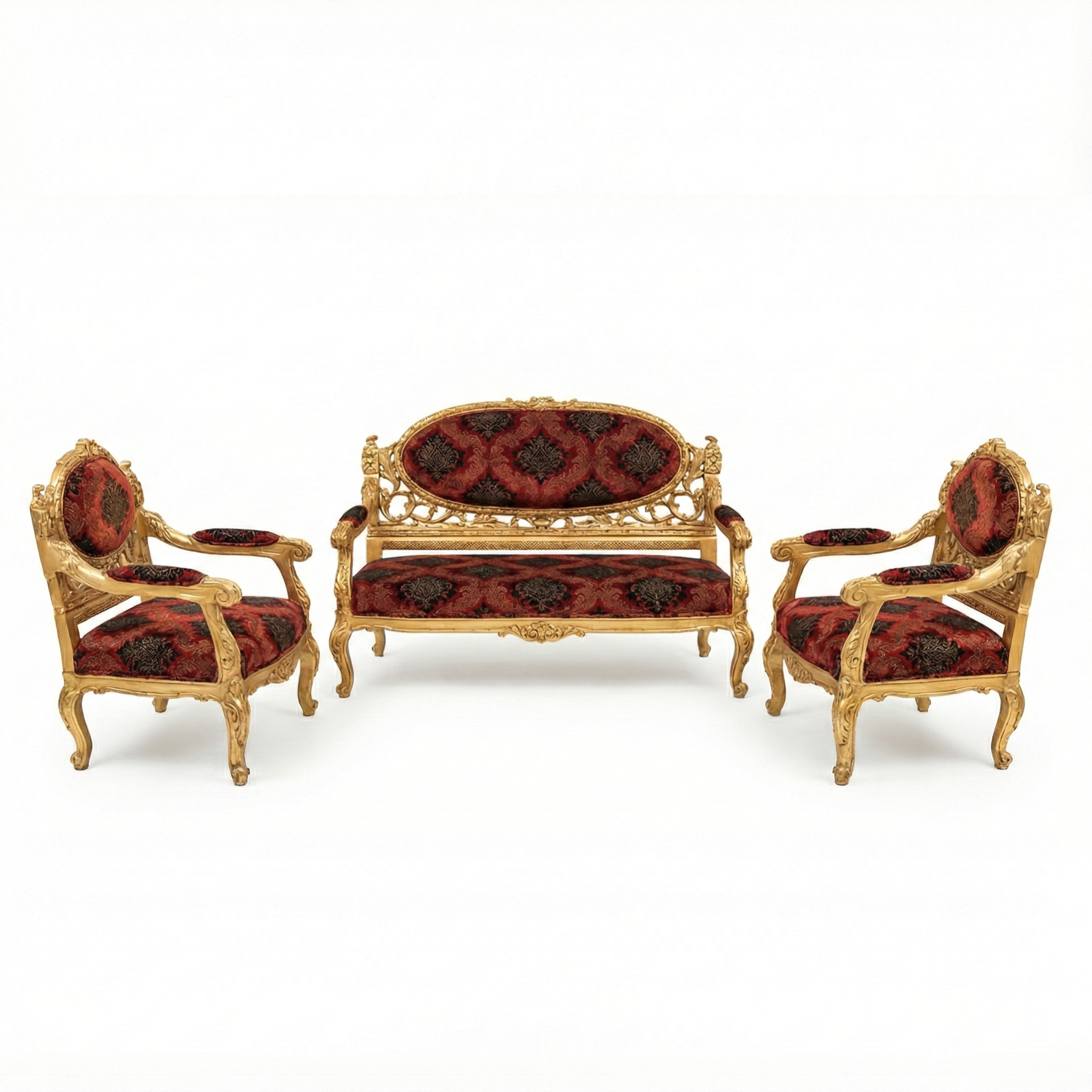 A classic European-inspired sofa set featuring ornate gold-finished woodwork and rich patterned upholstery, designed to bring royal elegance and timeless charm to luxury interiors.