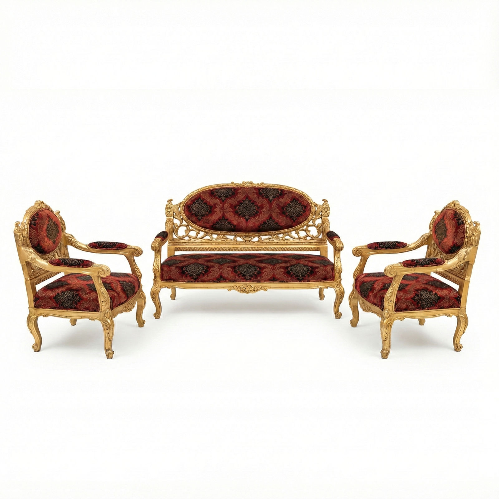 A classic European-inspired sofa set featuring ornate gold-finished woodwork and rich patterned upholstery, designed to bring royal elegance and timeless charm to luxury interiors.
